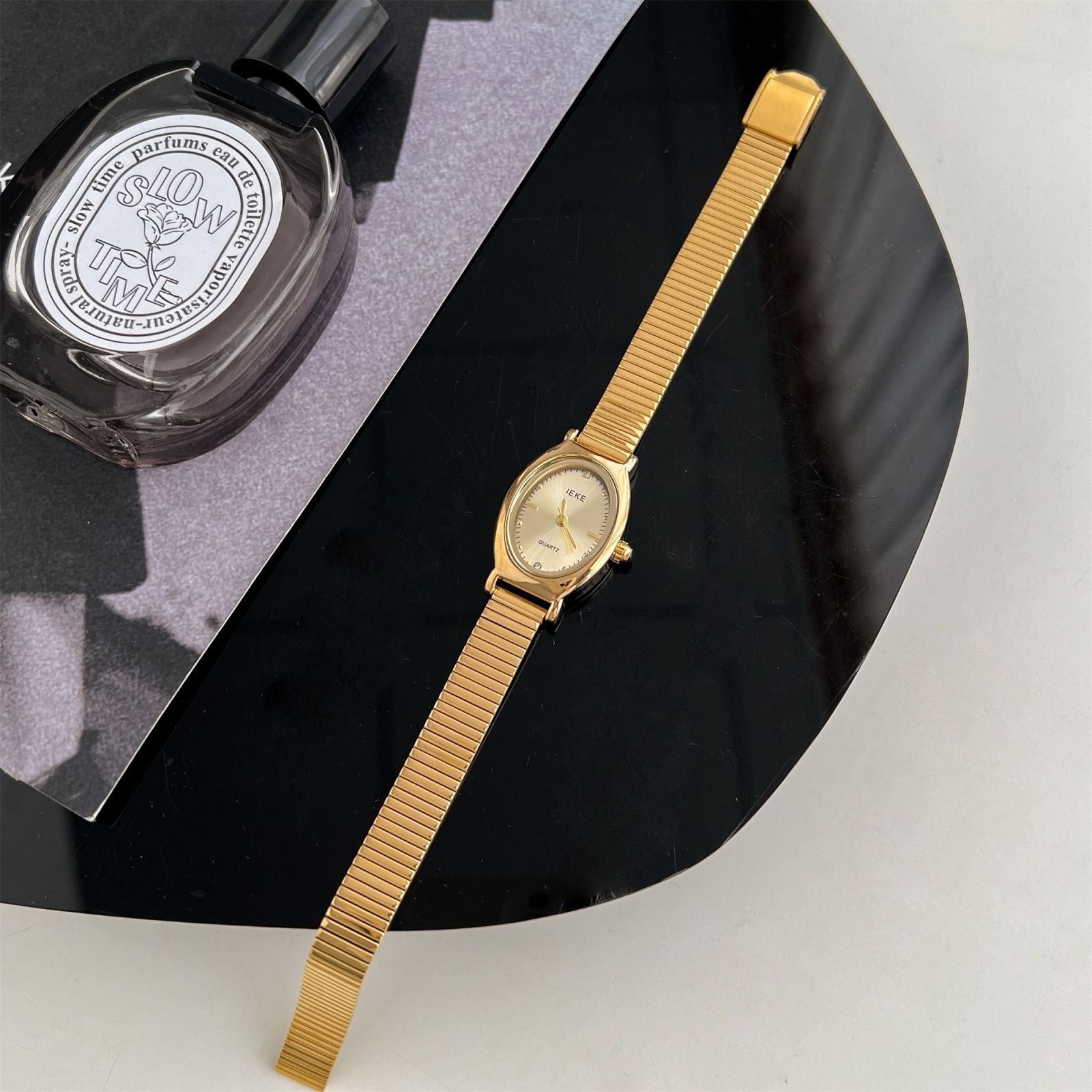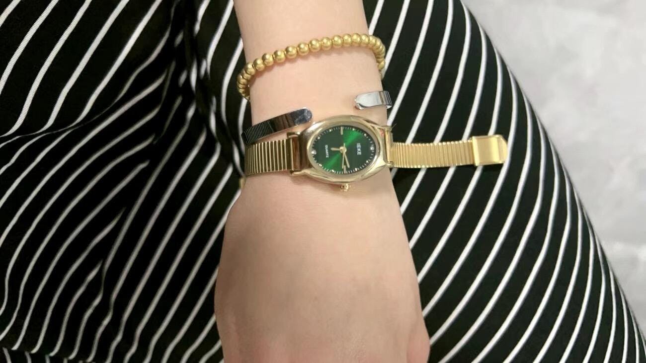 This exquisite women's stainless steel watch features a stunning green or white dial paired with a gold strap, making it look like a stylish bracelet. The green dial exudes vintage elegance, while the white dial showcases a simple yet captivating charm. It's the perfect accessory for any occasion.