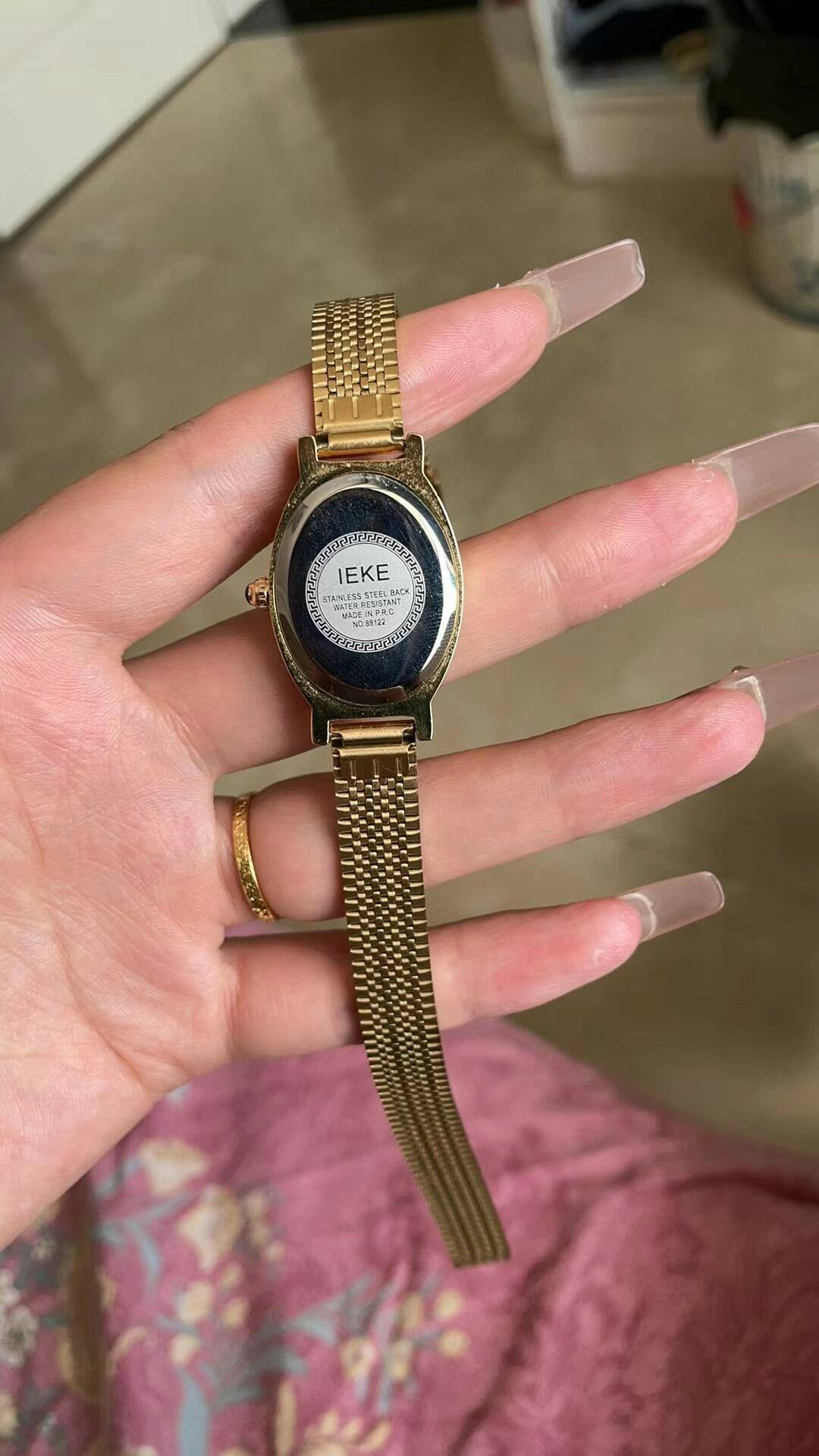 Hello everybody, I'm sitting here with my new gold toned watch and admiring it. It's a lovely oval shaped watch gold on gold that has Arabic numbers for reading the time. Its quartz innards are running great not missing a beat (minute) and it looks really nice on my wrist. It has a good old stainless steel stretch band that will pinch you if you're not careful. The description mentions water and scratch resistant which It seems to be so far.