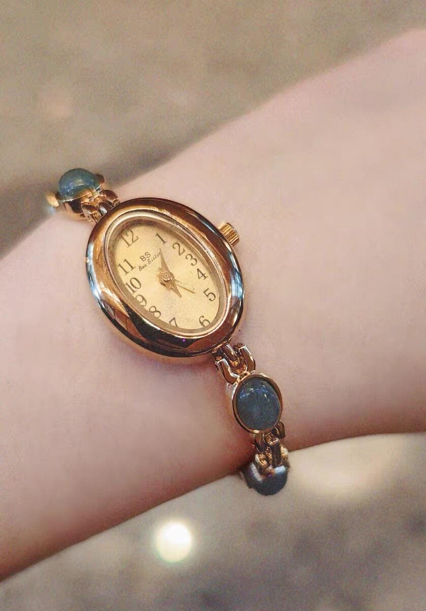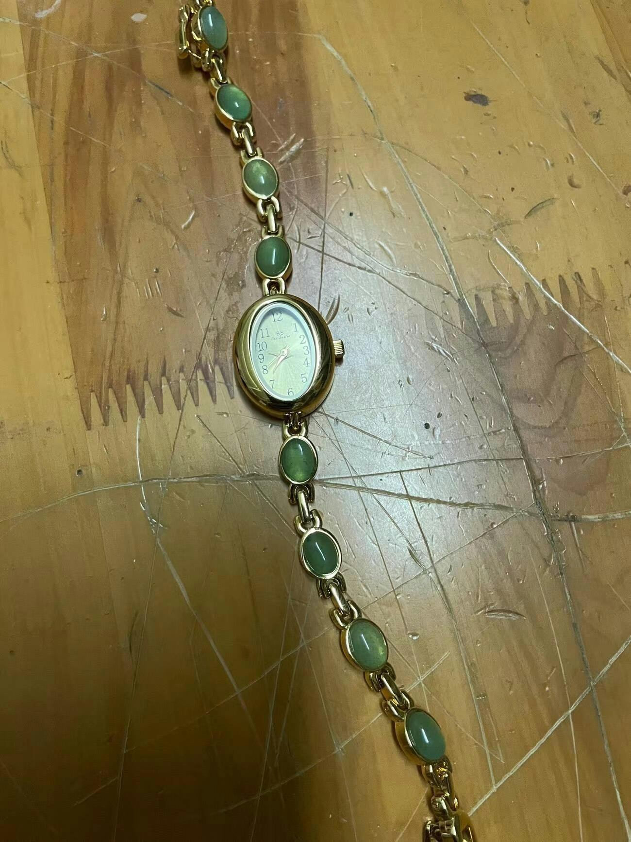 About this watch: This timepiece features a beautiful natural green jadeite bracelet, with each jadeite bead being unique. The petite oval dial is decorated with an elegant gold/silver border, adding a touch of vintage charm.